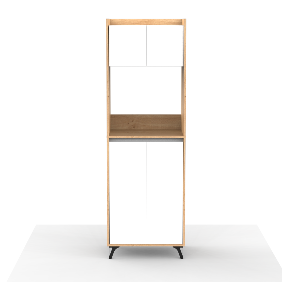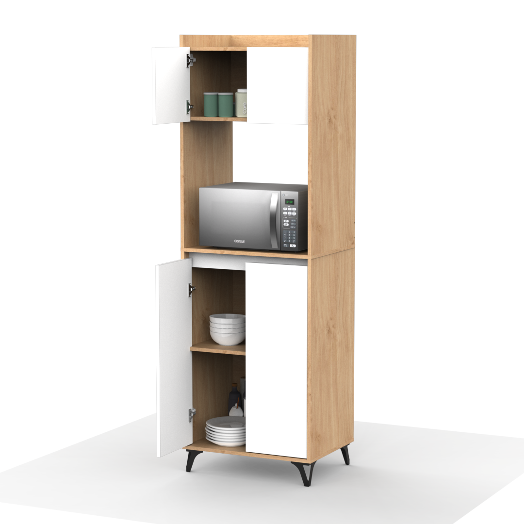 Este mueble auxiliar de cocina está fabricado en melamina de 15 mm, combinando estructura en tono madera con puertas blancas lisas. Cuenta con cuatro compartimientos: dos superiores y dos inferiores con puertas abatibles, ideales para almacenar vajilla, alimentos u otros utensilios. En el centro dispone de un espacio abierto para colocar un microondas u otros electrodomésticos. Se apoya sobre patas plásticas negras elevadas, que facilitan la limpieza y aportan un estilo moderno y funcional.