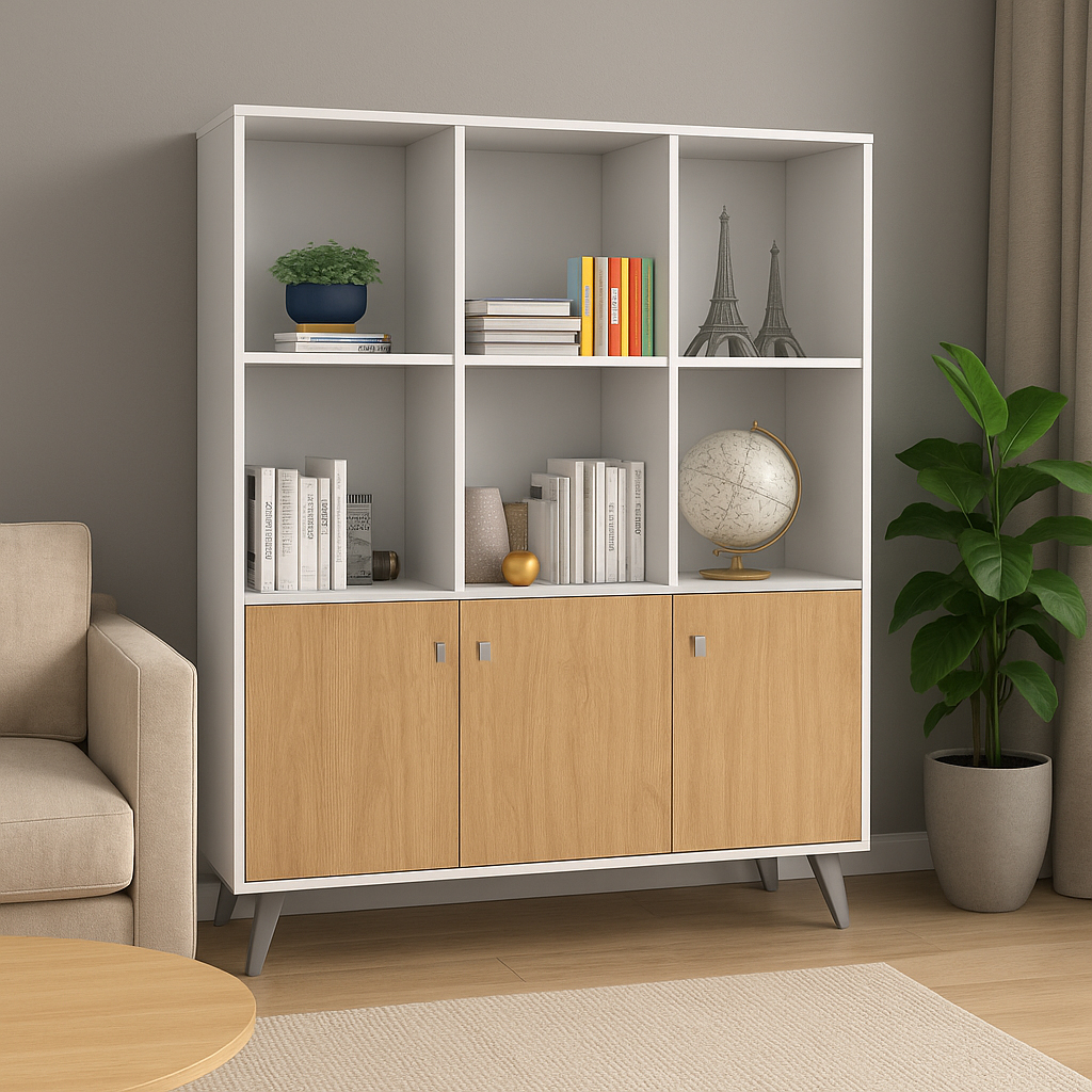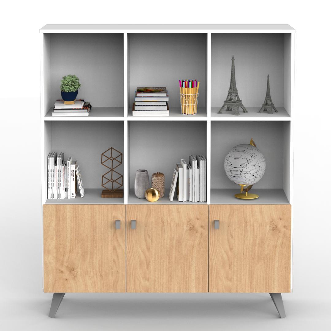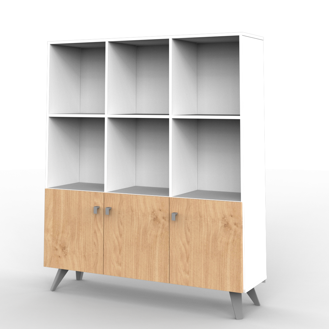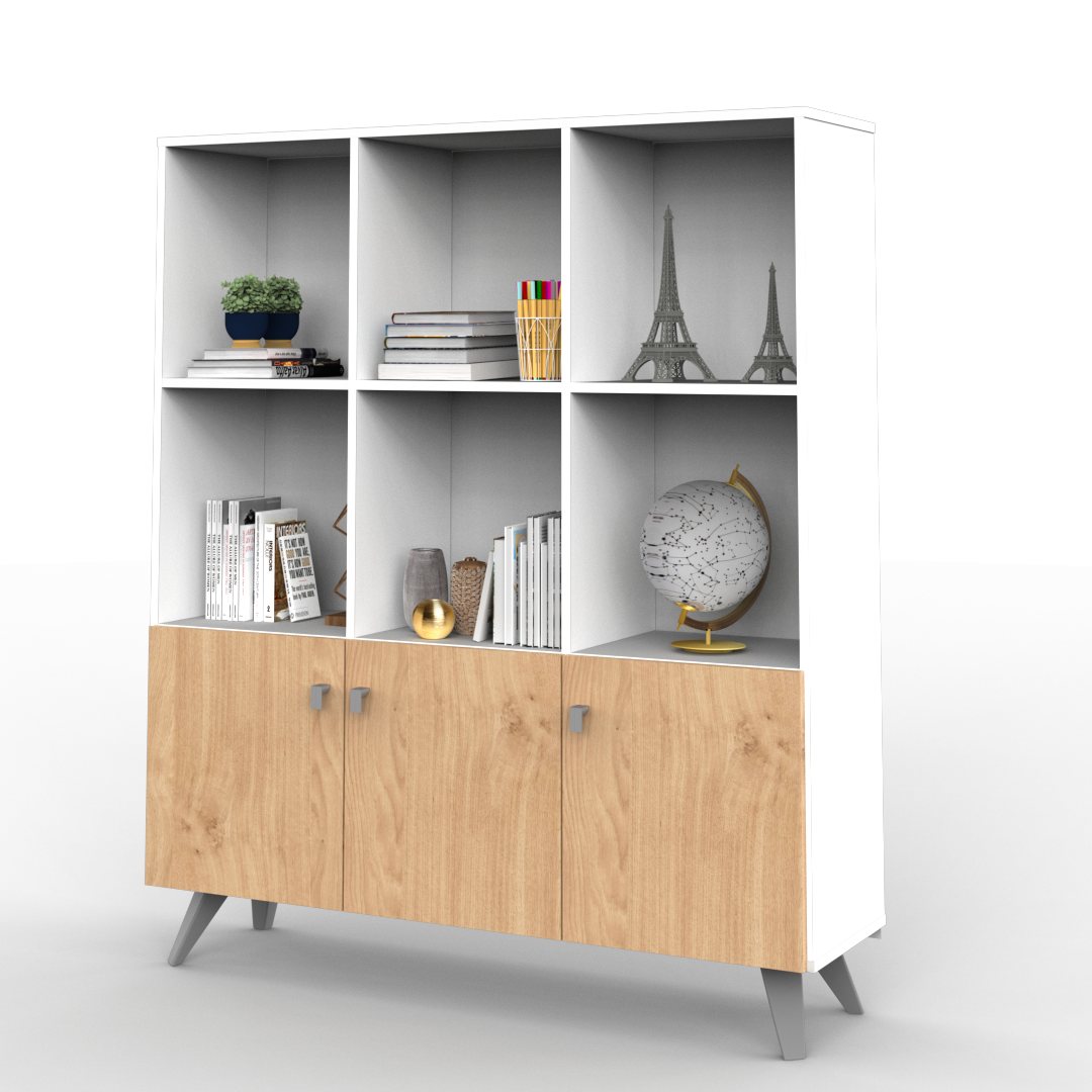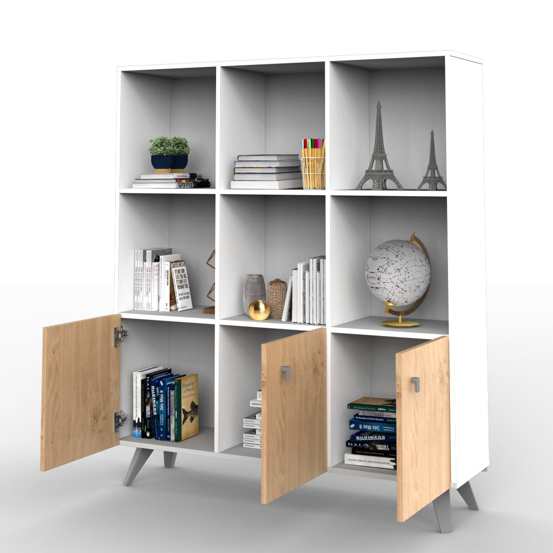 El módulo de tres cuerpos de la línea Escandinava se caracteriza por líneas simples y colores claros. Construido en melamina con un diseño nórdico este mueble está compuesto por nueve divisiones internas, tres cerradas con puertas y seis libres, puede ejercer varios usos dependiendo del ambiente en el que se lo utilice.