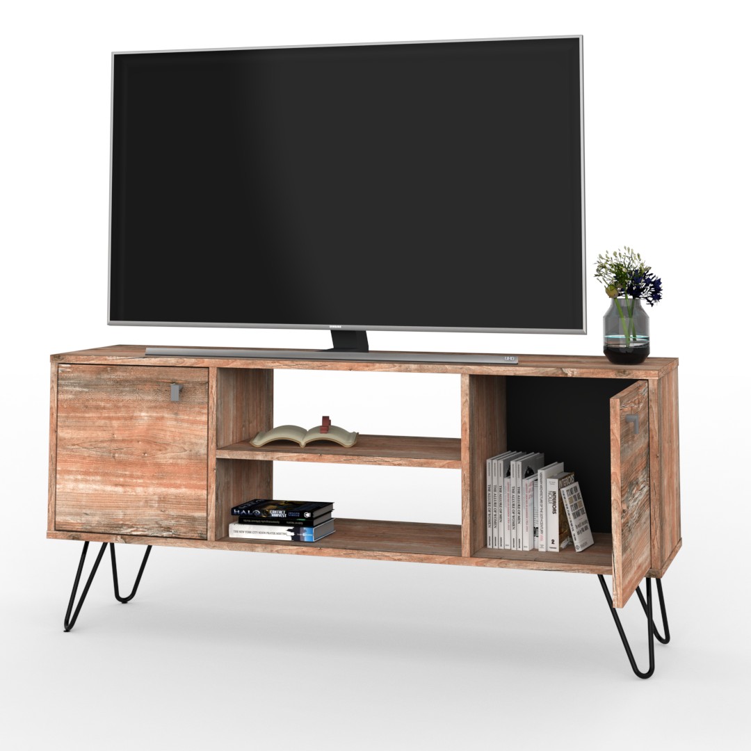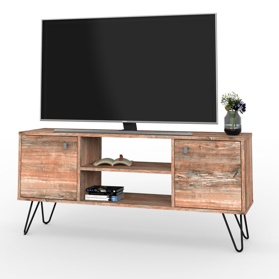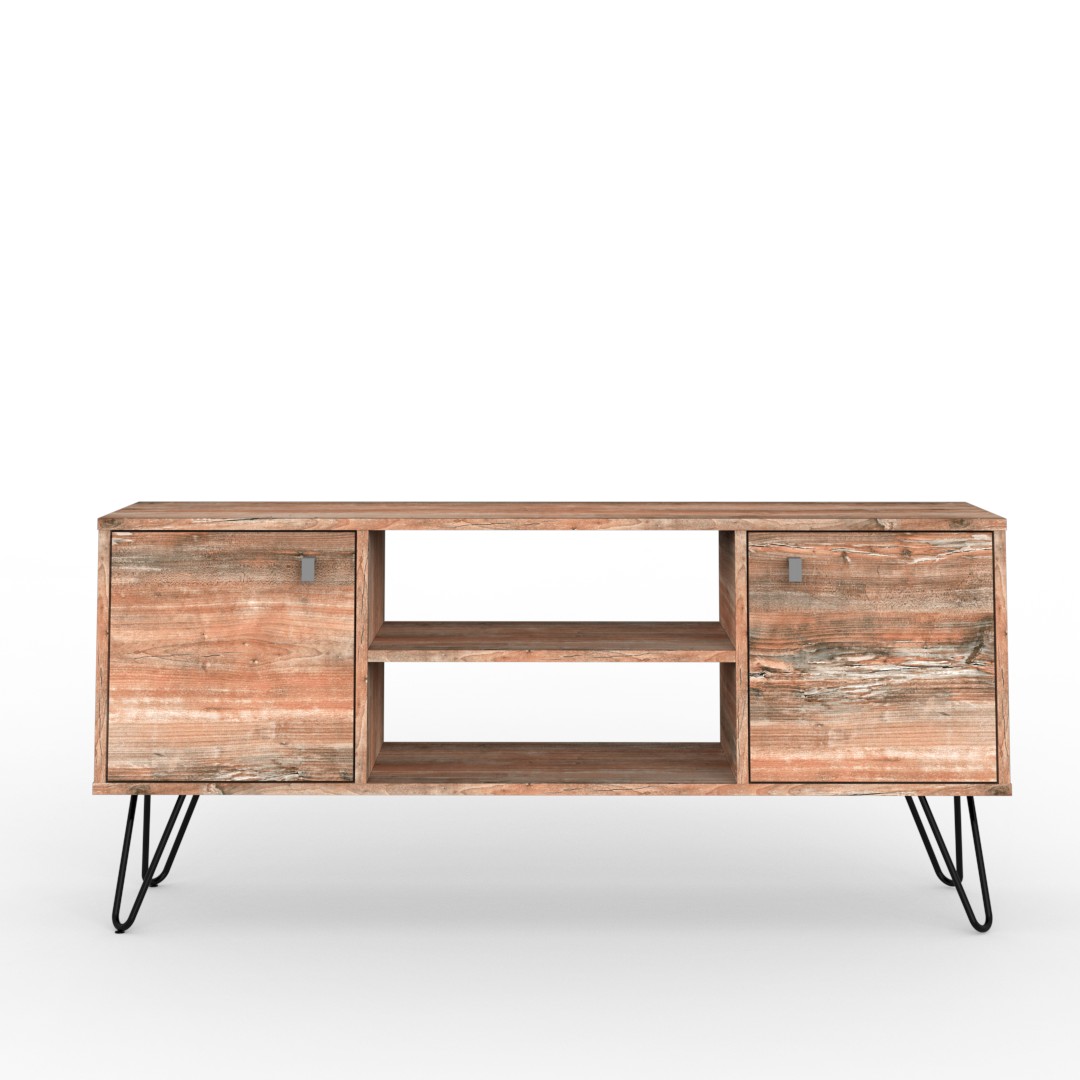 El rack de TV de la línea industrial se caracteriza por su acabado rústico. El diseño está compuesto por un cuerpo principal de melamina símil madera y patas de hierro macizo curvadas, las cuales poseen una felpa antideslizante para evitar cualquier inconveniente con el suelo.