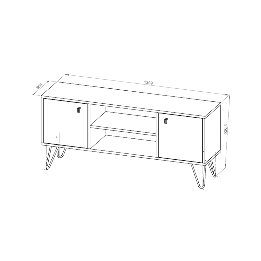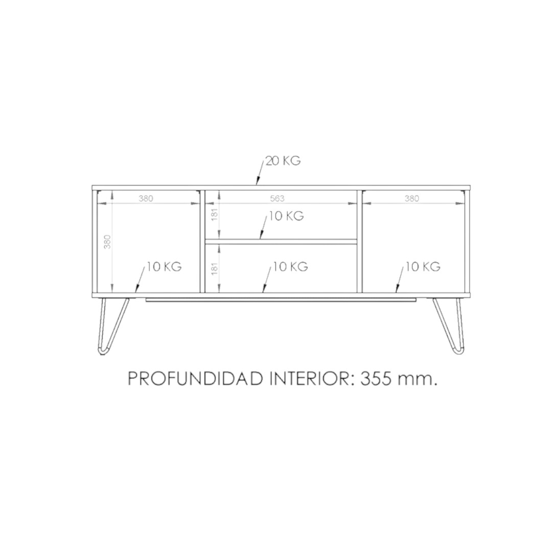 Este mueble posee tres divisiones internas, dos cerradas con puertas y una libre, con la intención de tener un espacio para colocar los artefactos que tengan controles remotos. Cuenta con tiradores de color negro los cuales acompañan con la estética del diseño.