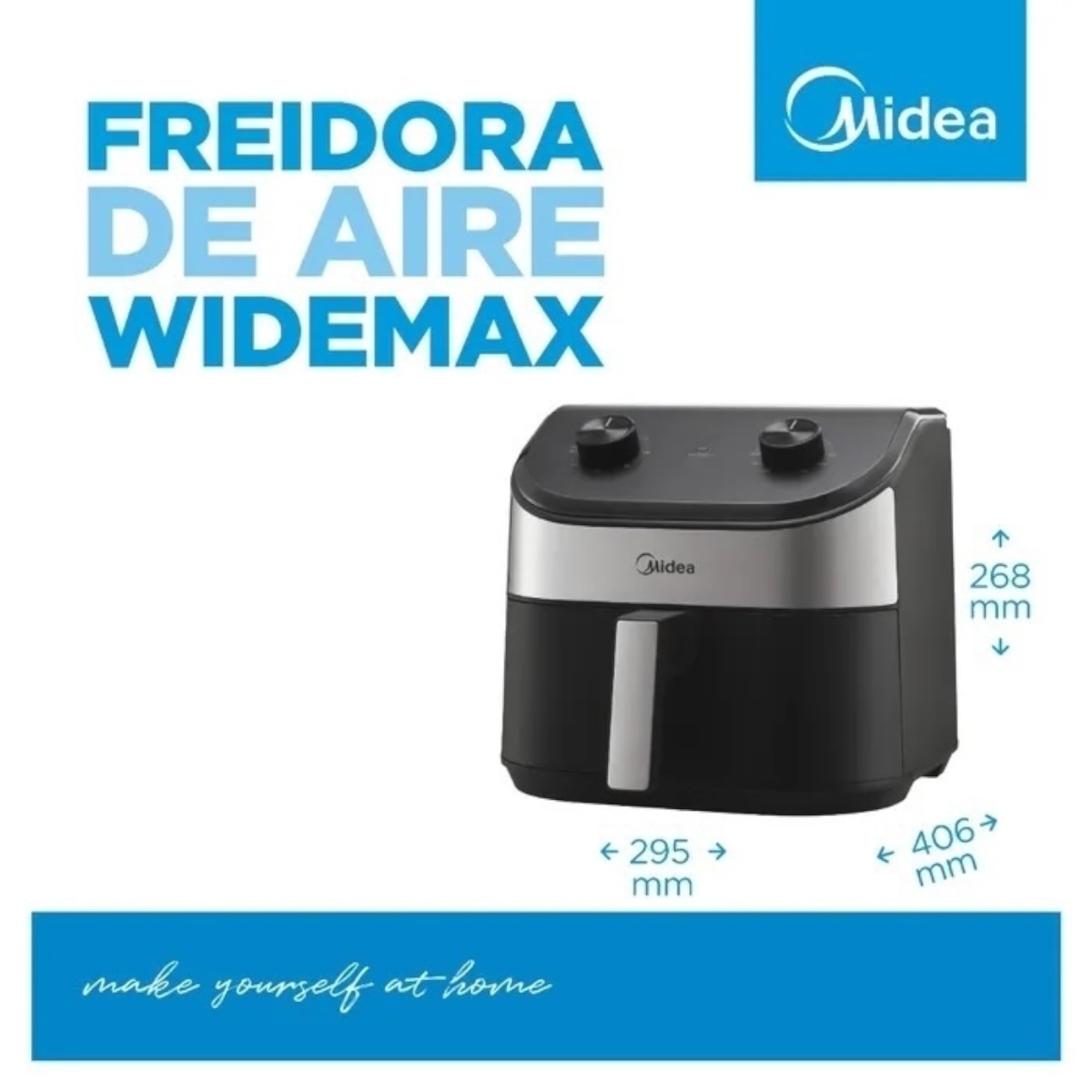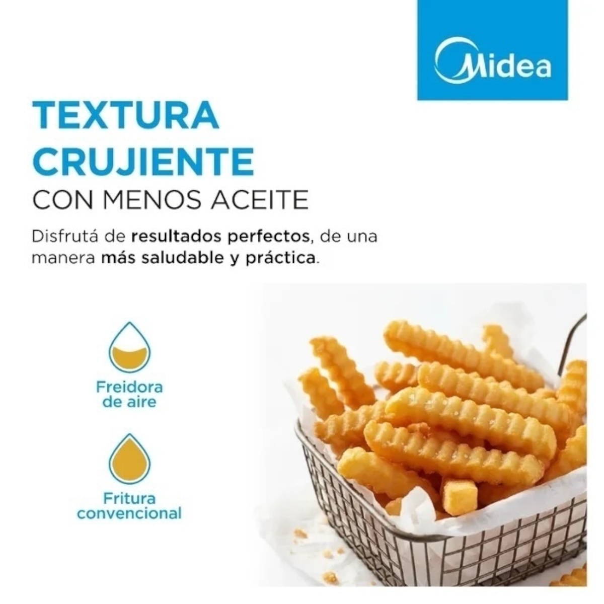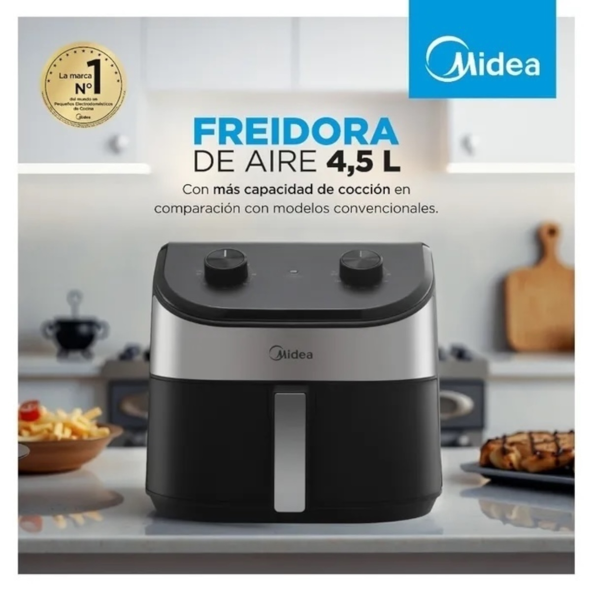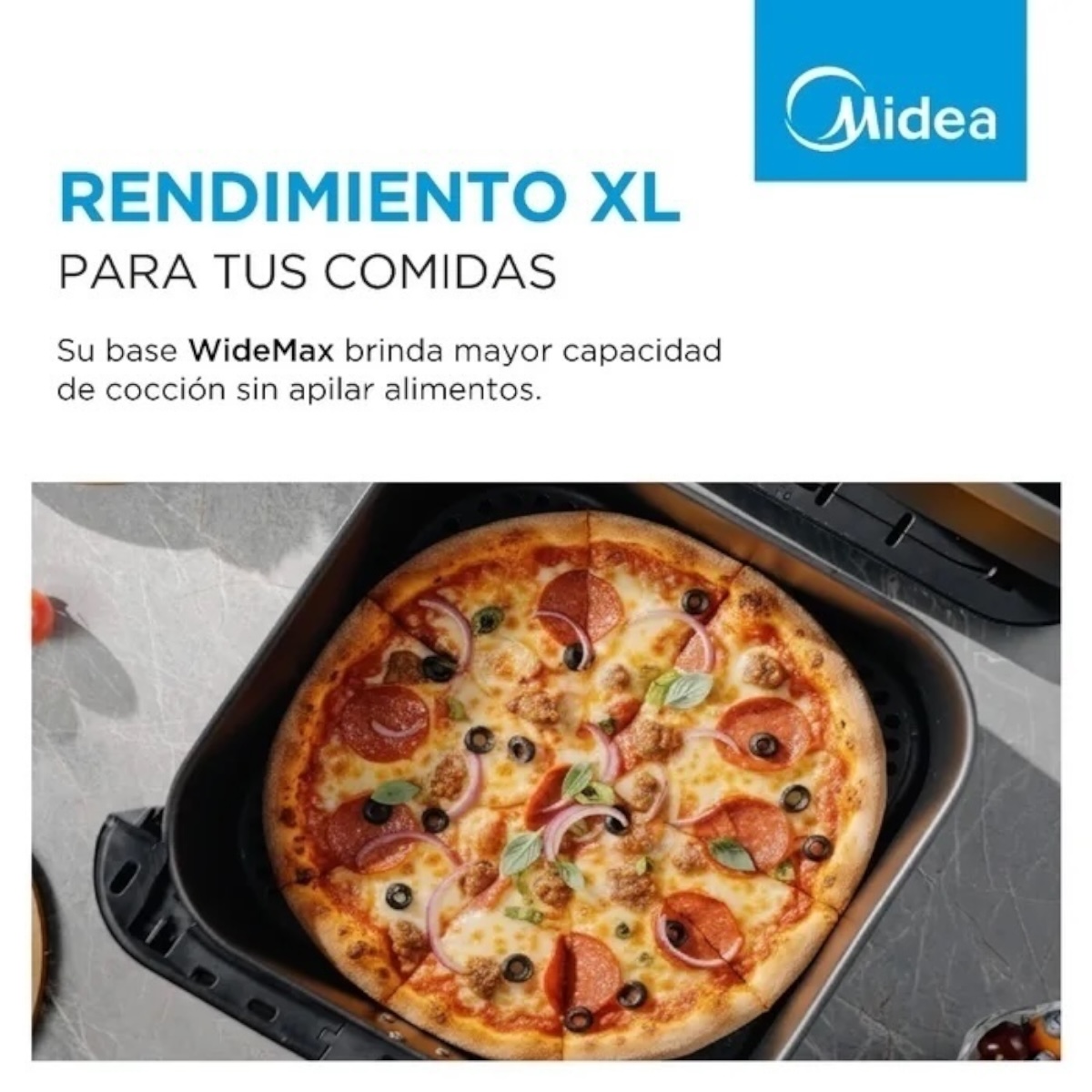 Freidora de aire Midea con capacidad de 4,5 litros, que ofrece mayor capacidad de cocción en comparación con modelos convencionales. Su diseño Widemax permite cocinar los alimentos sin apilarlos, logrando una cocción más uniforme y eficiente.